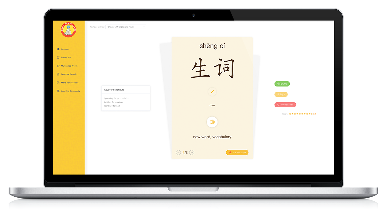 Al technology tests learner’s pronunciation. Provides feedback immediately, effectively improves learner’s tone and pronunciation. Build skills and practice vocabulary with customized flash cards. Multiple functions and tools like animated stroke order display with thousands of possibilities.