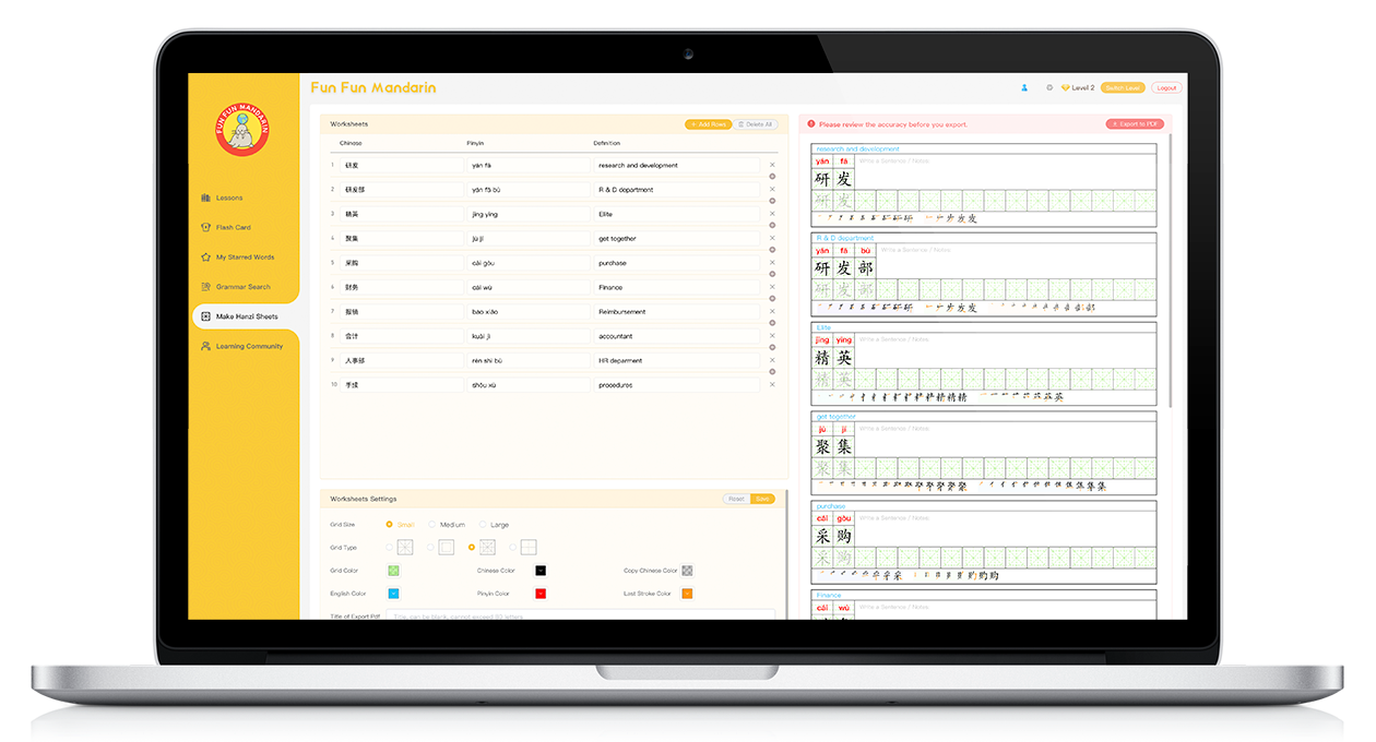 The best & unique Chinese Character sheet making tool in the world. Automatically translate Pinyin and English within 1 second. Customized colors, size, grid type.